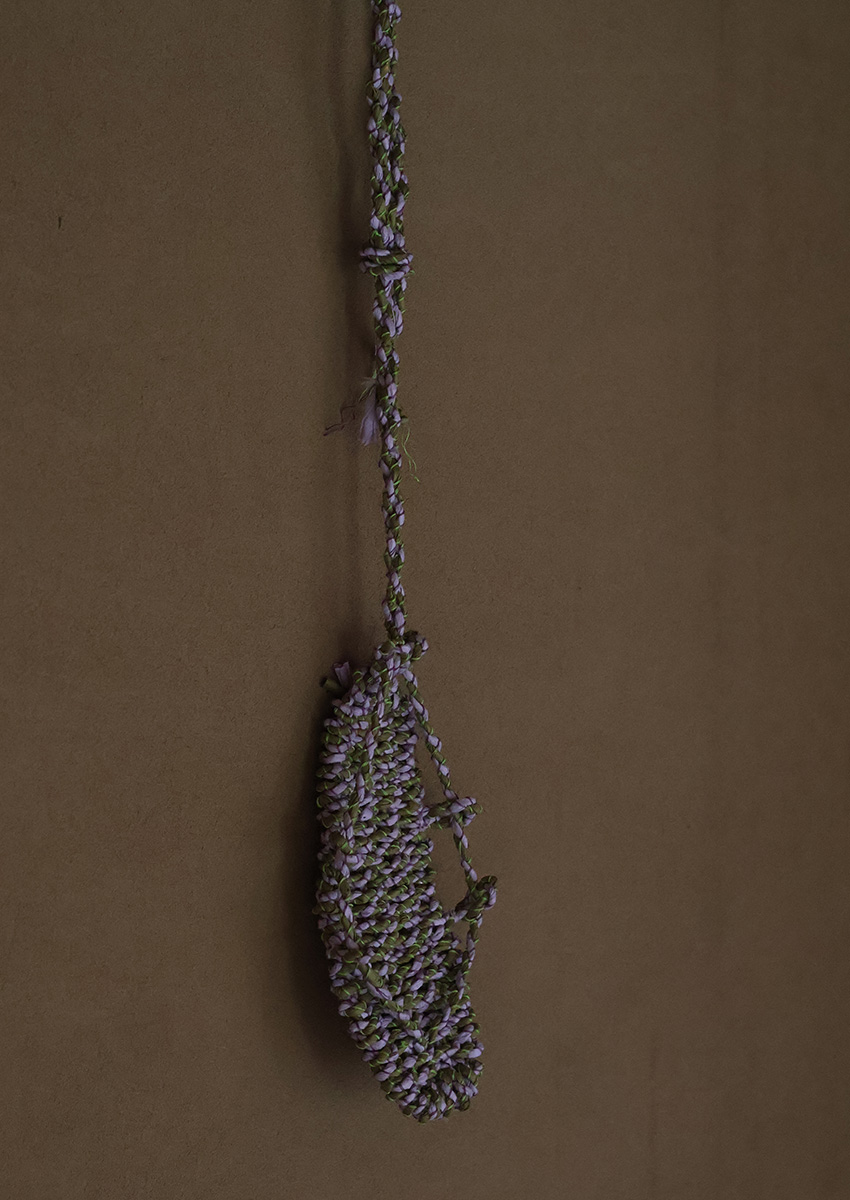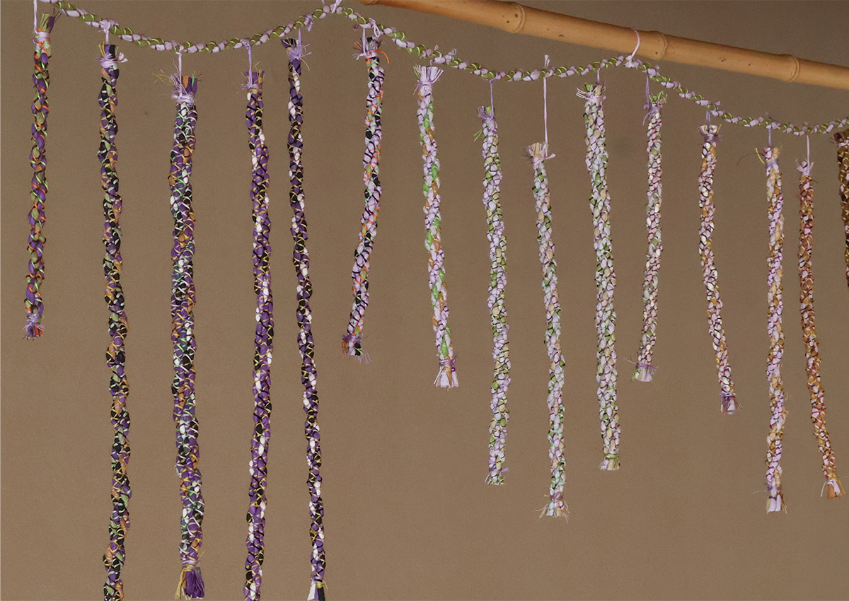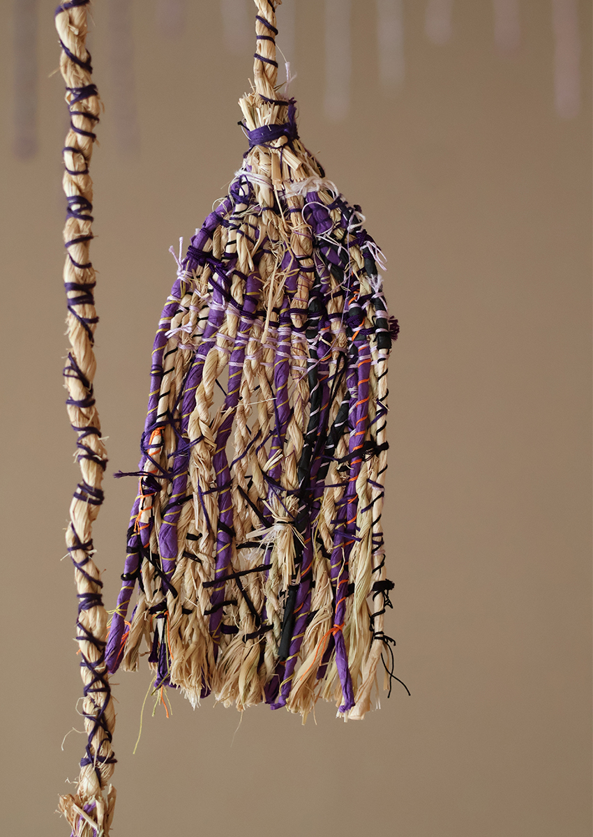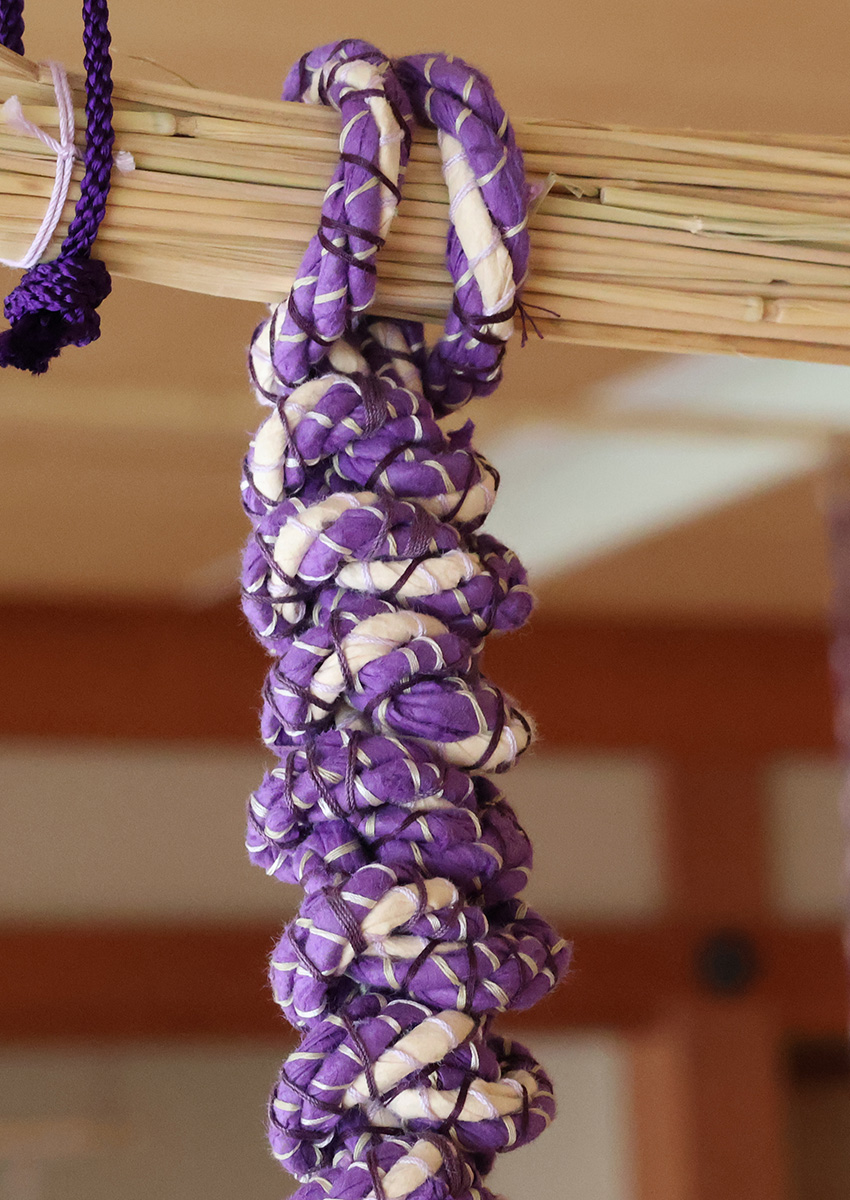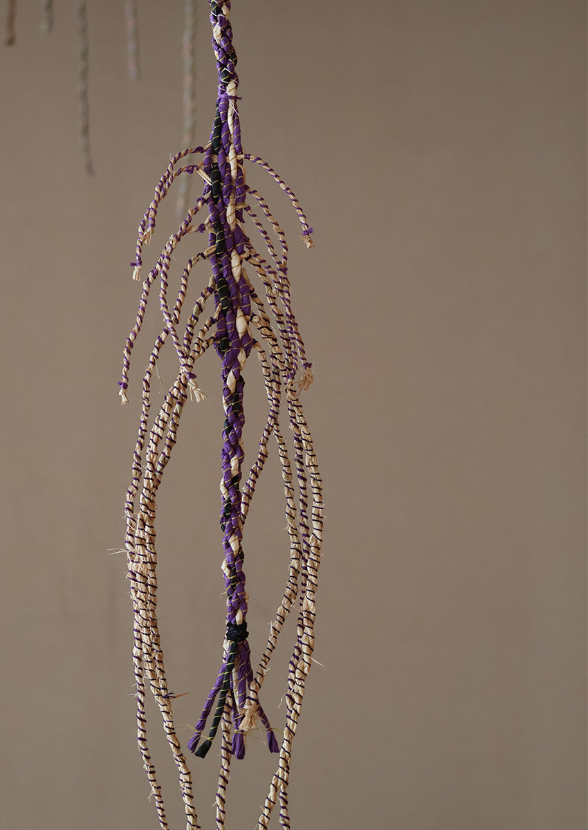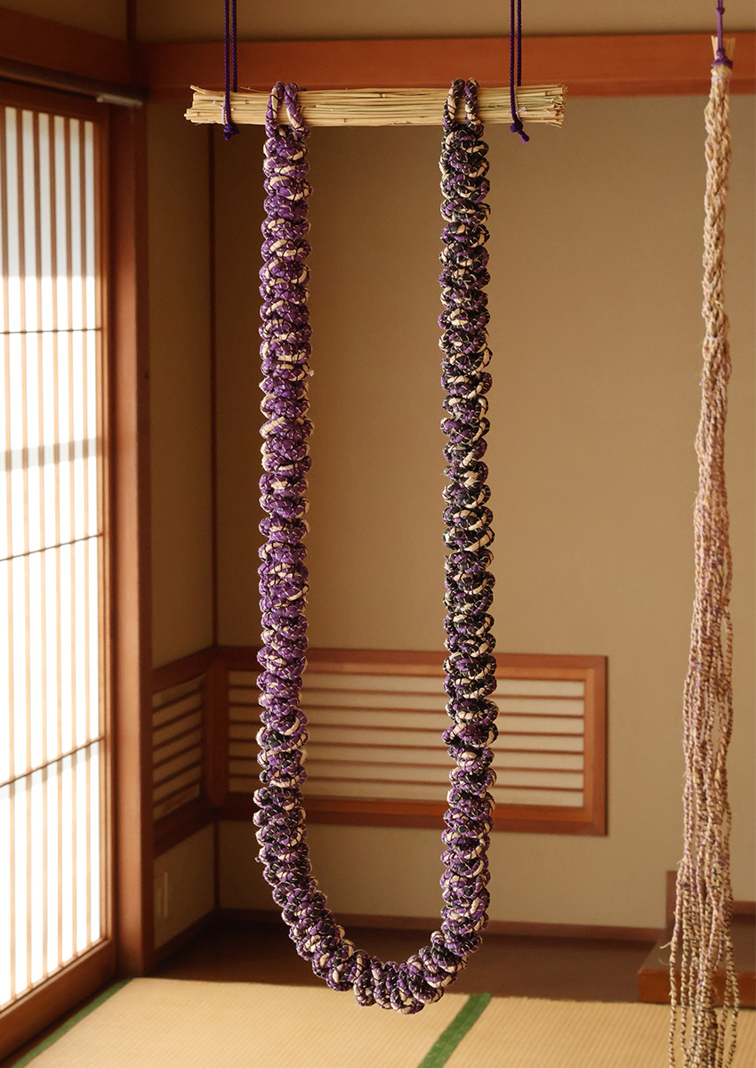 I have long been intrigued by the emergence of universal symbols and patterns across cultures. Inspired by shimenawa (sacred ropes in Japan), I created works that echo similar forms found in North Asian shamanic garments and the Andean quipu (knotted cords used for recording data). I was also drawn to the color purple, a hue deeply embedded in Japanese culture, where it is associated with royalty and Buddhist traditions. In contrast, contemporary Western culture often links purple to psychedelic and feminist art.